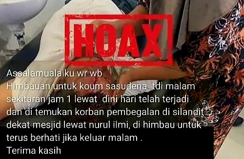 Setelah ditelusuri, unggahan dengan narasi “Assalamualaikum wr wb, himbauan untuk koum sasudena tdi malam sekitaran jam 1 lewat dini hari telah terjadi dan ditemukan korban pembegalan di silandit dekat mesjid, dihimbau untuk terus berhati jika keluar malam” dipastikan tidak benar atau hoaks.