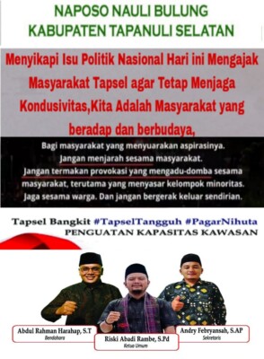KompasReal.com, Tapanuli Selatan – Menyikapi situasi sosial politik nasional terkini, Ketua Naposo Nauli Bulung (NNB) Tapanuli Selatan (Tapsel), Riski Abadi Rambe mengimbau masyarakat menjaga Keamanan dan Ketertiban Masyarakat (Kamtibmas).