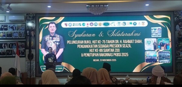 KompasReal.com,Medan – Tokoh nasional asal Sumatera Utara, Dr. H. Rahmat Shah, merayakan momentum bersejarah dalam hidupnya melalui rangkaian acara yang berlangsung khidmat dan penuh rasa syukur. Dalam kesempatan tersebut, Rahmat Shah merayakan Milad ke-75, meluncurkan buku terbarunya, sekaligus menerima amanah sebagai Presiden South East Asian Zoos and Aquariums Association (SEAZA). Momen ini juga bertepatan dengan Hari Ulang Tahun ke-89 Siantar Zoo serta kesuksesan Rakornas PKPBSI.